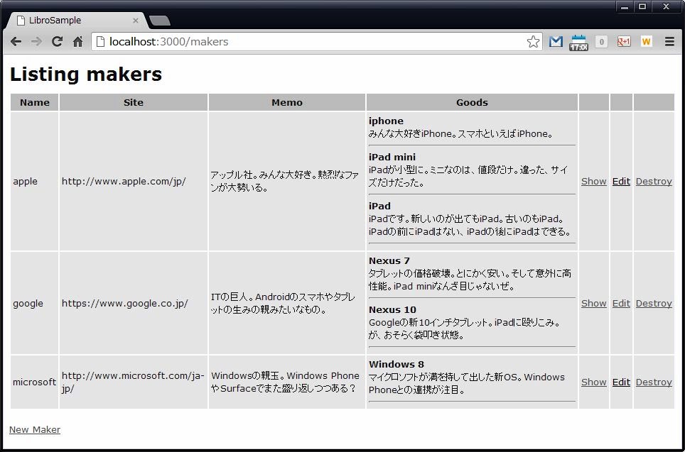では、index.html.erbを修正しましょう。先ほどのhas_aと同様に、レコードの一覧を表示するテーブルの部分を下のリスト欄にあげたように修正します。これで/makersにアクセスすると、各レコードに関連するgoodsのレコードがすべて表示されます。ここでは、以下のようにして関連するgoodsをすべて表示しています。
