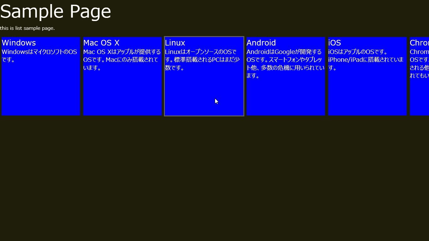 では、実際にデータを用意してリストビューにバインドしてみましょう。下のリスト欄にサンプルを掲載しておきました。リストビューのタグにdata-win-optionsを追加し、それからスクリプト側でデータとなる連想配列を用意しバインドします。