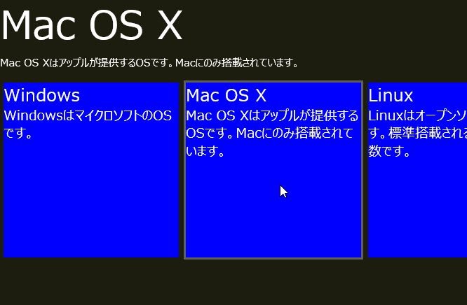 { title: "Mac OS X", content: "Mac OS Xはアップルが提供するOSです。Macにのみ搭載されています。" },