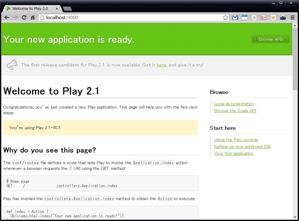 これで、作ったWebアプリケーションをビルドし、Play Frameworkに内蔵されているサーバープログラムが起動し、その上でアプリケーションが実行されます。play runで起動したら、以下のアドレスにブラウザからアクセスしてみましょう。サンプルで用意されたページが表示されますよ。