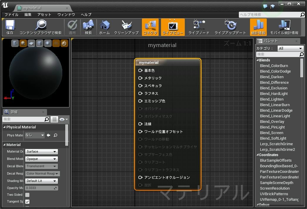 作成したマテリアルをダブルクリックして開くと、マテリアルエディタが現れます。これは、ブループリントエディタとほとんどそっくりですね。中央にグラフエディタがあり、左側にプレビューを表示するビューポートと詳細パネル。右側には利用可能なノードを一覧表示したパレットが並びます。マテリアルのノードは、このパレットからドラッグ&ドロップして作成できます。もちろん、通常のやり方(グラフ部分を右クリックしてポップアップしたメニューから選ぶ)でも作成できます。