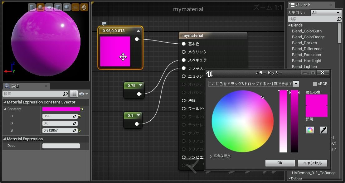 このConstant3Vectorは、詳細パネルに「Constant」という設定があり、そこに「R」「G」「B」という3つの値が表示されます。これらの値を指定することで色を設定できます。