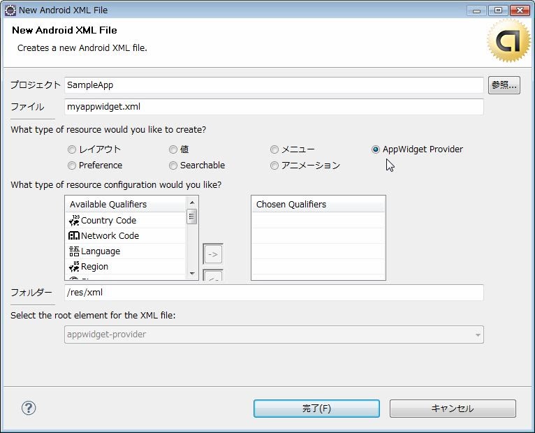 次に作るのは、AppWidgetプロバイダーの登録情報ファイルです。これは、「res」フォルダ内に、新たに「xml」というフォルダを作り、この中に「myappwidget.xml」というファイル名でXMLファイルを用意しましょう。ファイルの作成は、<ファイル><新規><Android XML File>メニューで作成できますが、ファイルの設定画面では、リソースの種類として「App Widget Provider」を選んでください。これでAppWidgetプロバイダー作成のためのテンプレートが書き出されます。