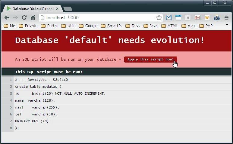 このファイルが用意されていると、Playを起動し、データベースアクセスを必要とする処理が実行された際に表示されるエラー画面(テーブルがないので当然エラーになります)で、「An SQL script will be run on your database」という表示が現れ、その右側に「Apply this script now!」というボタンが表示されます。このボタンをクリックすると、用意されたスクリプトが実行され、テーブルが作成されます。