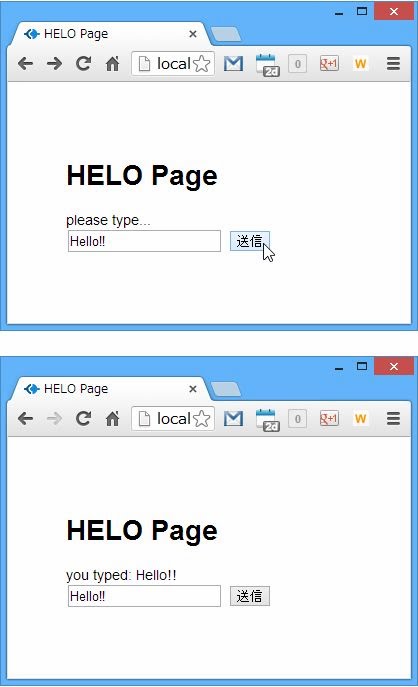適当に何か書いて送信すると、送ったテキストがフォームの上に表示されます。またフィールドに書いたテキストもそのまま保持されているのがわかります。
