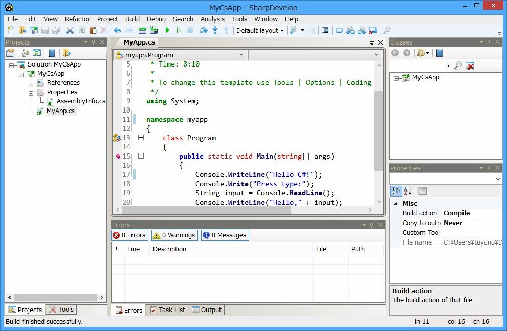 オープンソースで開発されているフリーの.net開発環境です。これが、意外によくできています。普通のWindowsアプリやコンソールプログラム、ASP .netのWebアプリなど一通りが作れます(Windows 8ストアアプリは現時点で未対応のようです)。対応言語もC#やVisual Basicだけでなく、Boo、F#、C++、Python、Rubyと多岐にわたっており、下手をすると純正のVisual Studioよりも強力です。この入門ではコンソールプログラムを中心に作っていくので、Visual Studioよりはこっちのほうが使えるでしょう。