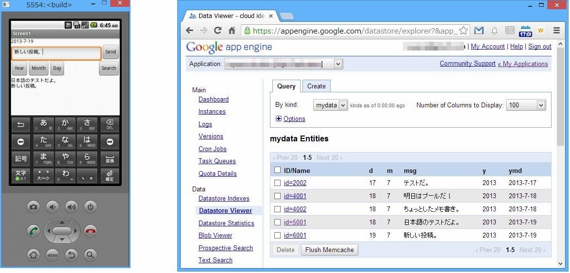 ※下図は、左が実行中のアプリ画面。 右がGAEサイトで見たデータストアの中身。
