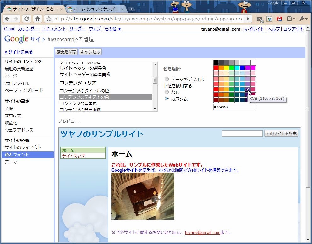 例えば、「コンテンツエリア」にある「コンテンツのテキストの色」を選択すると、テーマの設定だけでなく、カスタマイズする項目も表示されます。「カスタム」を選び、色のパレットから選択すれば、コンテンツのテキスト色が変わります。