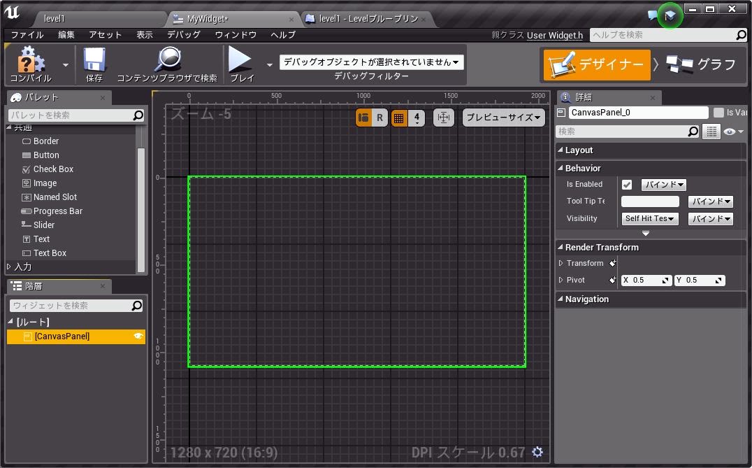 Widgetブループリントを開くと、デフォルトではGUIをデザインするための画面が開かれます。Widgetブループリントのエディタは、このGUIデザイン画面と、ブループリントのグラフを作成する画面をもっており、これを切り替えて作業をします。