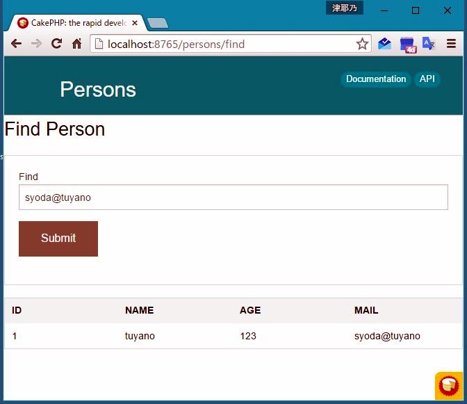 では、これらの利用例を下にあげておきましょう。ここでは、フィールドに検索テキストを書いて送信すると、nameかmailのどちらかにそのテキストを含むものをすべて検索します。また検索された最初と最後のエンティティのname、検索されたエンティティ数を最初にメッセージとして表示します。