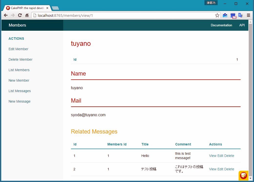 続いて、Membersのindexに作成された「View」リンクで表示されるページについてです。先ほどのindexでは、Viewリンクをクリックすると、