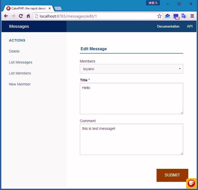 見ればわかるように、addアクション用のテンプレートとほぼ同じです。フォームタグの生成は、$this->Form->create($member)というようにフォームヘルパーを使って行います。また、Form->inputを使い、nameとmailの編集フィールドを作っています。こうして作成されたフォームの送信処理を、下のリスト欄のようにeditメソッドで実装しておきます。