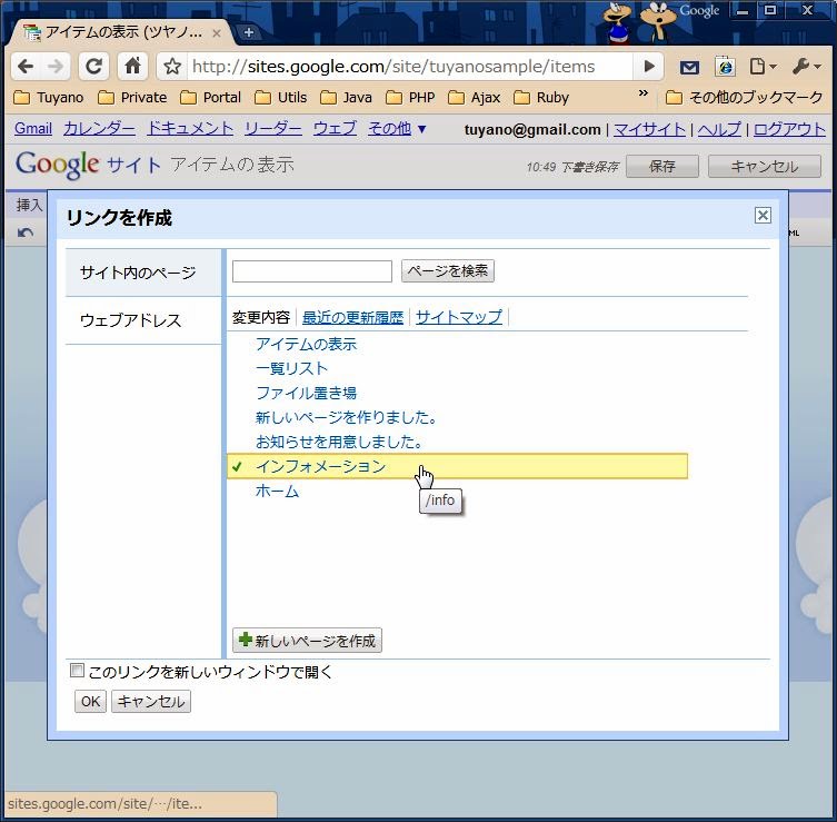 これを選ぶと、画面に作成するリンク先のページを選ぶダイアログが現れます。このWebサイト内のページについては、ここからページの名前を選ぶだけで、自動的にリンクが作成されます。非常に簡単ですね。