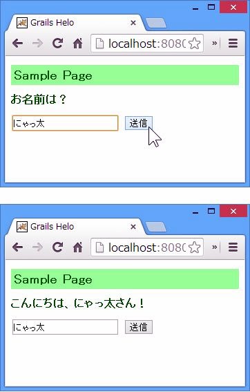 このparamsによる値の取得を利用する際には、注意すべき点が1つあります。それはフォームからの送信にかぎらず、クエリー文字列を利用した送信も全く同じように値が得られる、という点です。例えば、下のサンプルで、http://localhost:8080/GralisApp/helo/index?input=helloこのようにアクセスすると、画面に「こんにちは、helloさん!」と表示され、入力フィールドには最後に送信した値として「hello」と表示されます。つまり、フォームの送信を簡単に偽装できるのです。