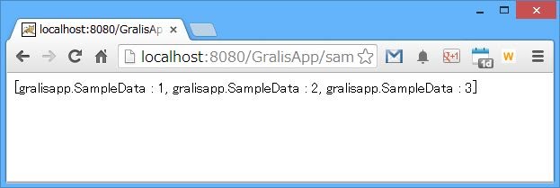 ――というわけで、ダミーのデータも用意し、ドメインクラスを使う準備が整いました。実際にサーバーで実行し、 http://localhost:8080/GralisApp/sampleData/ にアクセスしてみてください。以下のようなテキストが表示されます。