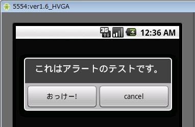 }割とよくある実装法は、このように無名クラスとしてonClickメソッドを実装するやり方でしょう。ここでクリックした際の処理を記述しておけばいいわけです。もちろん、Activityクラス自身にDialogInterface.OnClickListenerをimplementsしたり、別にクラスを用意して実装してもかまいません。では、以下に利用例をあげておきましょう。ここではOK/Cancelの2つのボタンを表示し、クリックするとTextView(textというIDにしてある)に簡単なメッセージを表示させています。処理そのものは別に難しくないので、実際に書いて動かしてみればすぐに使い方はわかるでしょう。