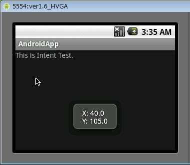 実際に簡単なサンプルをあげておきましょう。これは、画面をタッチすると、タッチした位置をトーストで表示するサンプルです。onTouchEventでMotionEventから位置の情報を取り出し、Toastで表示しているのがわかるでしょう。