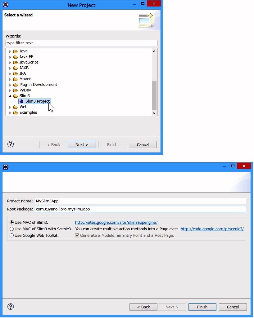 5. その下には、プロジェクトのMVCアーキテクチャーを選択するラジオボタンがあります。プラグインでは、Slim3標準のものの他、Scenic3というライブラリやGoogle Web Toolkitなども選択できます。ここではSlim3を選択してください。