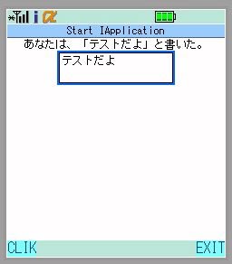 起動してTextBoxにテキストを書き、左のソフトキー(CLIKと表示されたもの)を押すと、メッセージが表示されます。また右のソフトキー(EXITと表示されたもの)を押すと、プログラムを終了します。