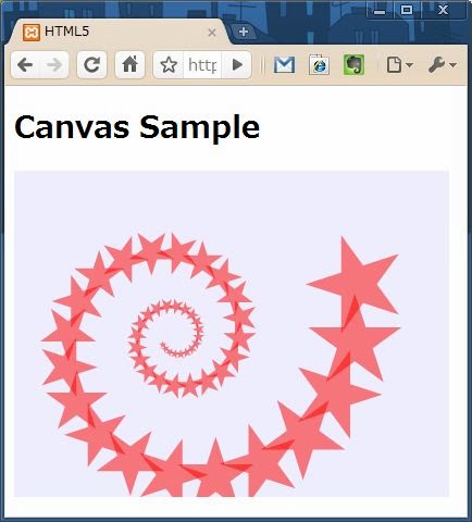ここでは、create5Starという関数を用意し、これを呼び出すことで五芒星のパスを作成するようになっています。そして、draw関数では、forによる繰り返しの中で、translate/scale/rotateを呼び出してはcreate5Starを実行し、fillする、ということを繰り返しています。