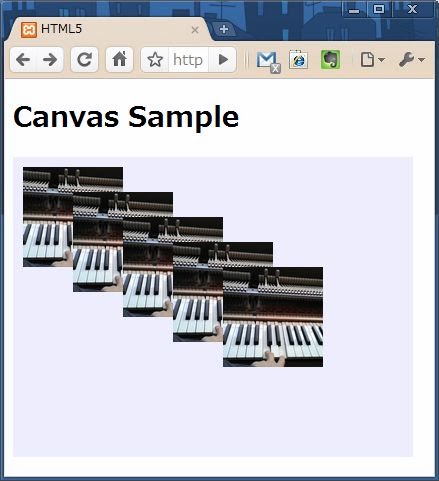 下に、簡単なサンプルをあげておきましょう。ここでは、同階層に用意した「image1.jpg」というイメージファイルをロードし、位置をずらしながら繰り返し描画を行っています。イメージ生成の処理部分を見てください。
