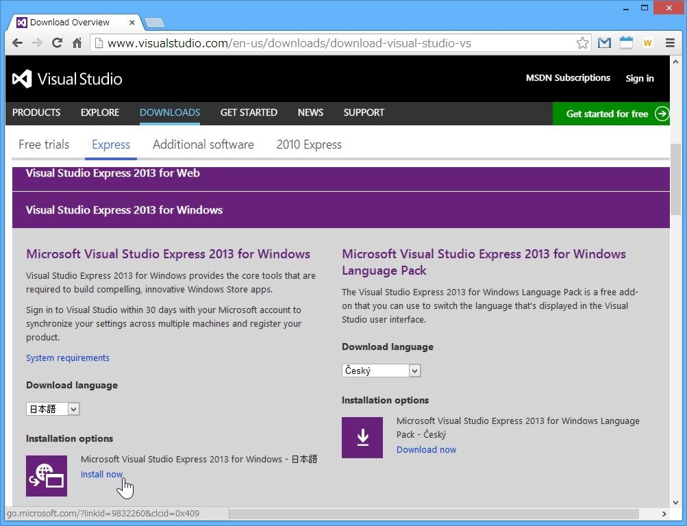 ここから、「Visual Studio Express」というところにある「Visual Studio Express 2013 for Windows」というものをクリックしてください。インストールのためのリンクなどが現れるので、ここで「Download Language」から「日本語」を選び、その下の「install now」リンクをクリックしましょう。