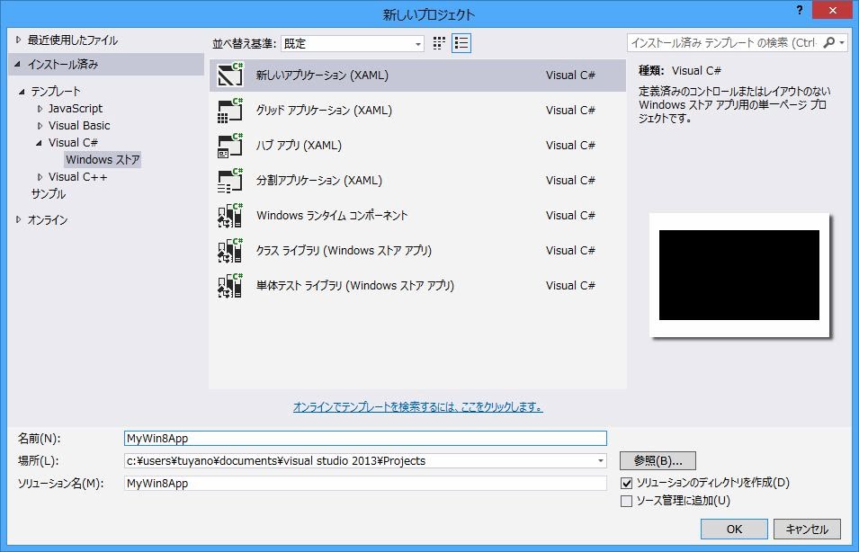 下の部分には、プロジェクトの名前と保存場所、そしてソリューション名を指定する入力フィールドがあります。今回は、名前のところに「MyWin8App」と入力しておくことにします。場所は、デフォルトで設定されているままにしておきます。またプロジェクトの名前を入力すると自動的にソリューション名も設定されるので、これもそのままでOKです。