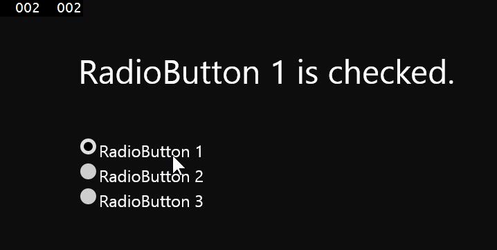 作成後、各RadioButtonのCheckedイベントにRadio_Checkedを割り当てましょう。ラジオボタンを切り替えると自動的にTextBlockの表示が変わるようになります。