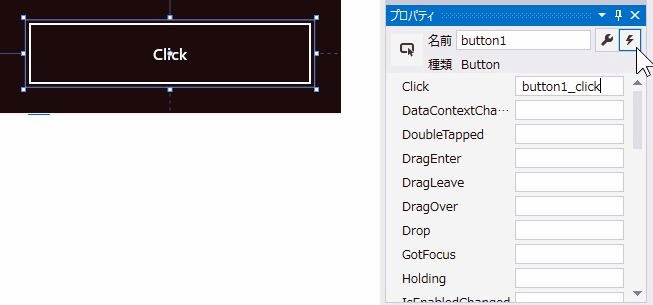 これは、プロパティのウインドウで設定することができます。画面に配置したButtonをクリックして選択してください。そしてプロパティのウインドウの右上(名前の入力欄の右側)にある稲妻のアイコンをクリックしましょう。すると、下に表示されていたプロパティ名のリストから、イベントハンドラ名のリストに表示が切り替わります。