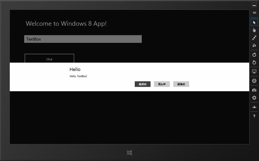 このUICommandを使えば、簡単にダイアログのボタンをカスタマイズできます。下に簡単なサンプルを挙げておきました。ボタンを押すとダイアログを表示し、そのボタンを押したらそのボタン名をTextBlockに表示します。