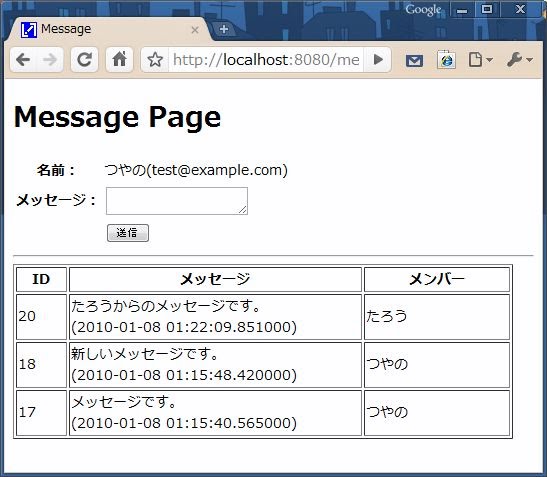 続いて、MessageDataの作成と一覧表示をする、<B[message.htmlテンプレートを作成しましょう。ソースコードは、以下にあげるリストのようになります。