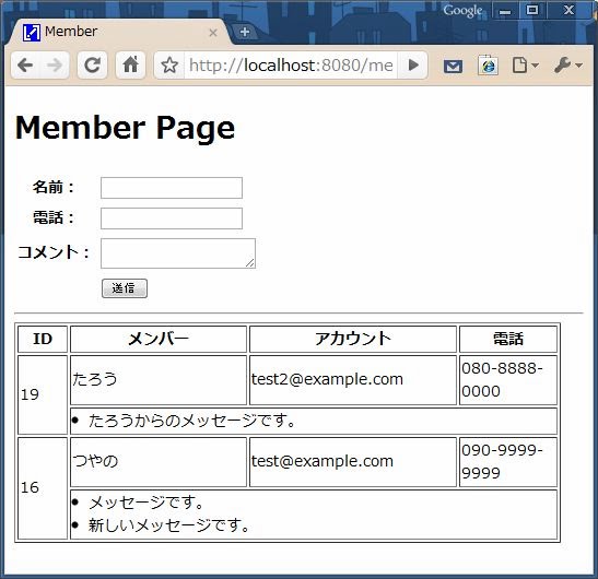 先ほどのmember.htmlに記述してあった、MemberDataの一覧を出力するテーブル(<hr />タグ以降の部分)を、以下のリストのように書き換えてみてください。そして、アクセスしてみましょう。すると、それぞれのメンバー情報の下に、そのメンバーが投稿した全メッセージが表示されるようになります。