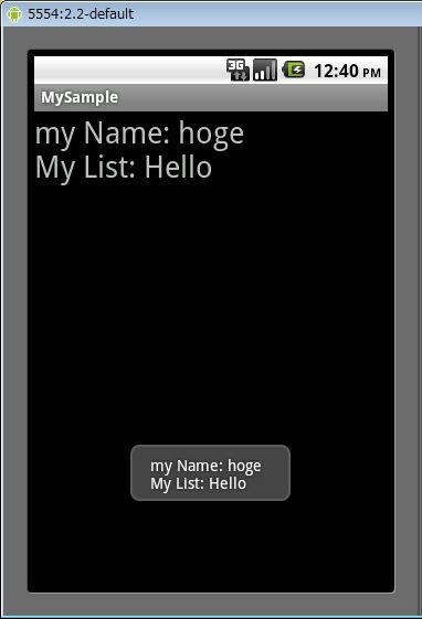 メソッドでは、これらの値で取り出した値を使い、textview01にテキストを設定し、Toastインスタンスを作ってshowしています。