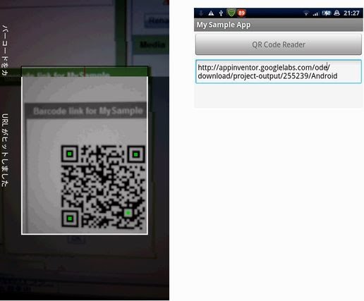 では、できあがったアプリを動かしてみましょう。これはエミュレータではなく、必ず実機で実行してください。エミュレータにはカメラがないので……。