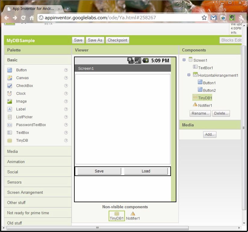 では、TinyDBの利用例として、テキストを保管する簡単なメモアプリを作ってみましょう。今回は、データの保存と取り出しの単純な機能だけを持ったアプリを作ってみます。デザイナで、以下のように部品を配置していきましょう。