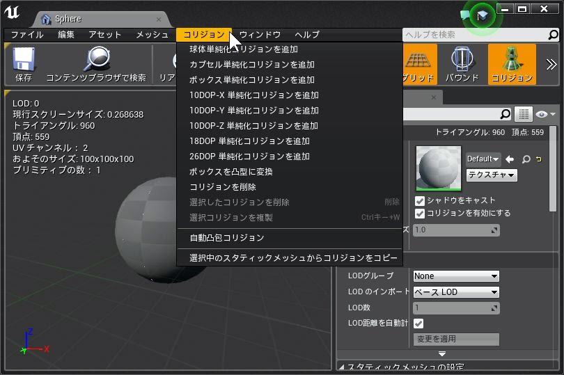 ※下図はスタティックメッシュエディタ。「コリジョン」メニューが用意されている。