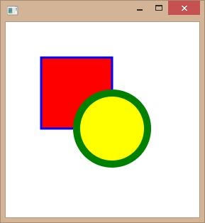 下にサンプルを挙げておきます。ここではcreateShapeというメソッドを用意し、その中で四角形と円のシェイプを描画しています。最初にFXMLで作ったサンプルと同じようなものですから、両者を比較してみると違いがよくわかるでしょう。