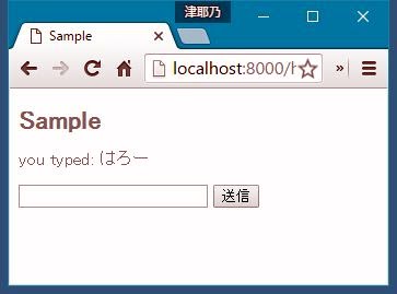 修正したら、内臓サーバーを実行して、http://localhost:8000/helo にアクセスしてみてください。入力フィールドが1つだけ表示されるので、何か書いて送信してみましょう。するとフォームのすぐ上に、「you typed: ○○」というようにして、入力したテキストが表示されますよ。