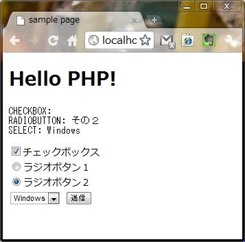 下に、チェックボックス、2つのラジオボタン、3つの項目があるリストを表示したフォームのサンプルをあげておきます。これを実際に動かして、それぞれの値がどう送られるのかを調べてみましょう。