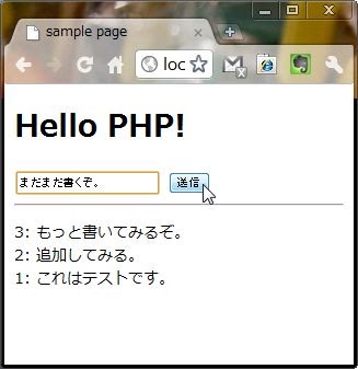 用途に応じてこの2つのモードを使い分けるようにしてください。では、下に簡単なサンプルをあげておきましょう。これは、簡単なメモ書きアプリです。入力フィールドからテキストを書いて送信すると、それがファイルに追加されます。入力フォームの下には、保存したメモが、新しいものから順に番号付けして表示されます。