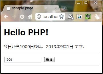 では、簡単な利用例をあげておきましょう。下のサンプルは、入力フィールドに日数を書いて送信すると、今日からその日数後の日付を計算して表示するものです。考え方はとても簡単。