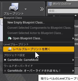 とりあえず、ビギナーのうちは「ブループリント=レベルブループリント」と考えていいでしょう。レベルブループリントは、ツールバーの「ブループリント」アイコンをクリックし、現れたメニューから「レベルブループリント(を開く)」を選ぶと専用エディタが開かれます。またUnreal Engine 4.7では、シーンアウトライナーにレベルと同じ名前のブループリントが部品として追加されており、これをダブルクリックして開くこともできます。