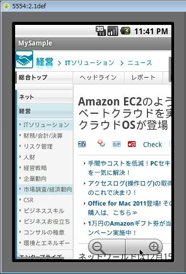 例えば、デフォルトの状態では、Androidのブラウザ特有の「+」「-」記号によるズームボタンが表示されませんし、JavaScriptも動きません。こうした機能も、WebViewの設定を行うことで利用可能になります。