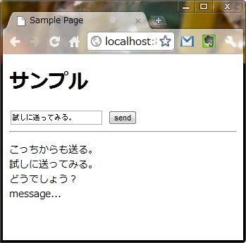 HTMLページにアクセスし、メッセージを送ると、それが下に追加されていきます。同時に複数のブラウザからアクセスすると、それらすべてにメッセージが送信されます。