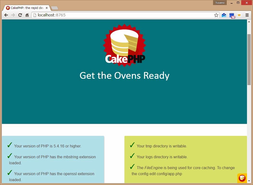 http://localhost:8765/CakePHPのサーバーでは、このようにポート番号8765を指定して実行されます。これでWebアプリケーションのトップページにアクセスし、ページが表示されます。問題なくプロジェクトが作成されて入れば、「Get the Ovens Ready」と表示されます。