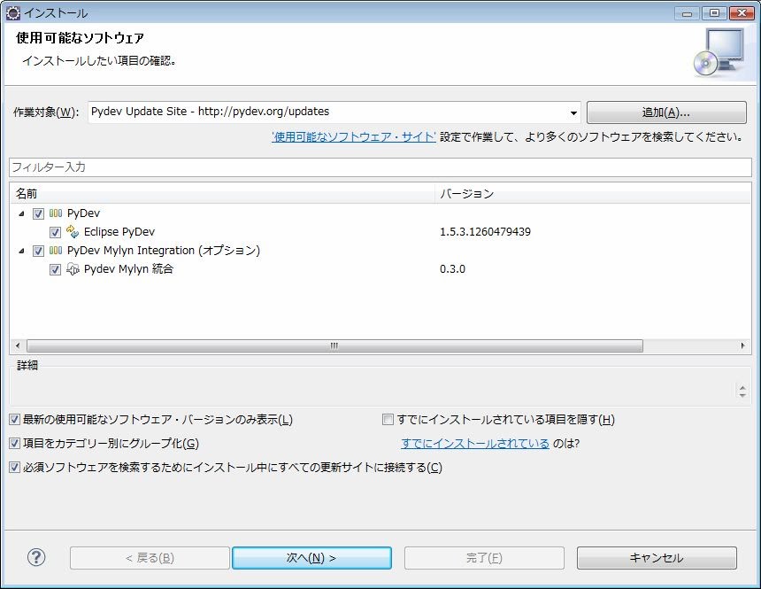 これで、サイトにアクセスし、その下に「PyDev」「PyDev Mylyn Integration」といったインストール可能な項目が表示されるようになります。ここに表示される項目をすべてチェックし、次へ進んでインストールを行ってください。基本的に、すべてデフォルトのまま進んでいけば、PyDevがインストールできるはずです。