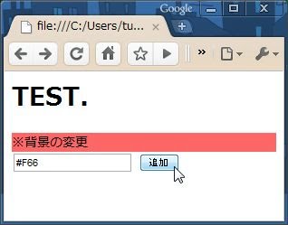 下のリストに、簡単なサンプルをあげておきます。入力フィールドに色の値を入力してボタンを押すと、表示されているメッセージの背景色が変わります。ここでは、入力フィールドのvalueを取り出し、ターゲットである<div>タグのエレメントを取得して、そのstyle.backgroundの値を変更しています。ボタンを押すと、瞬時にメッセージの背景色が変わります。エレメントのスタイルを操作すると、こうした表示の操作が簡単に行えるのです。