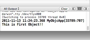 では、作成したMyTestClassを使ってみましょう。下のリスト欄に簡単な利用例をあげておきます。MyObjCApp.mのソースコードをこのように修正して実行してみてください。コンソールに「This is First Object!!」とメッセージが出力されます。