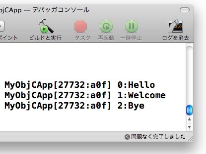 NSArray* arr = [NSArray arrayWithObjects:@"Hello",ざっとこんな感じですね。NSArrayにいくつかのNSStringを保管しておき、その全要素をNSLogで出力しています。NSArrayの値を取り出して利用するのは、このように非常に簡単です。