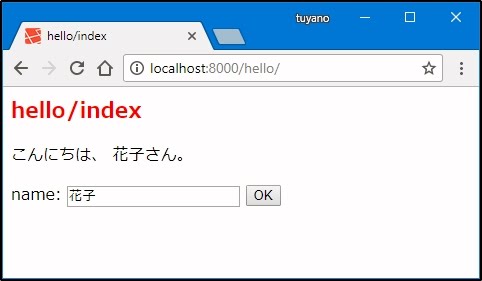 では、「hello」内のviews.pyの中に記述したindex関数を下のリスト欄のように修正して下さい。そして、/helloにアクセスして、現れたフォームから送信してみましょう。名前を書いて送ると、「こんにちは、○○さん。」と表示されます。